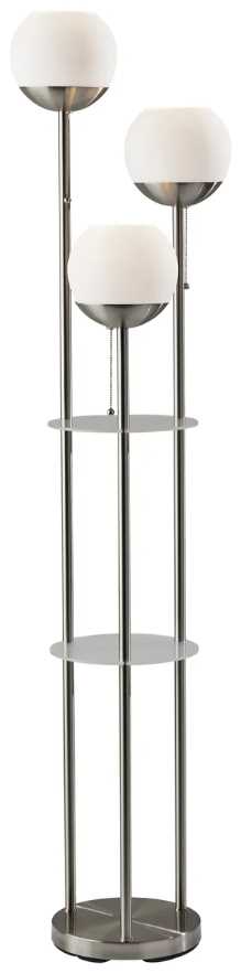 The Bianca floor lamp is also available with an antique brass finish. The 10" metal base with a brushed steel finish makes for a sturdy design, while the three brushed steel poles arranged in a triangular pattern rise cleanly to three lighting heads of varying heights for an eye-catching design. The three 7" globe shades are made of white opal glass that complements the shelving and can be operated separately with pull chains, allowing you to control the amount of lighting. Each of the three globe shades ensconces 40W bulbs (not included), while the lamp also features a 5' clear cord.