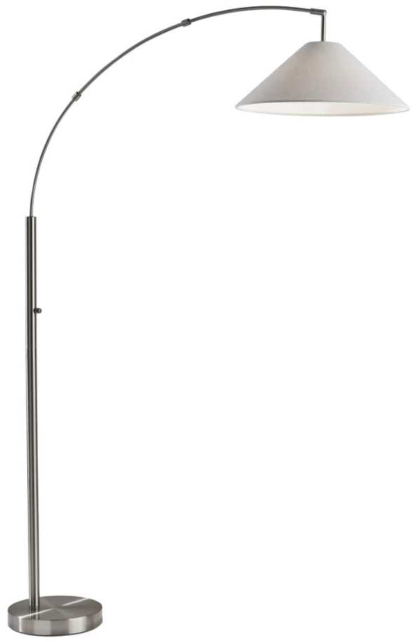 The Braxton Arc floor lamp is also available with a dark bronze finish and coordinating light brown textured fabric shade. For even greater versatility, the lamp's head features an adjustable joint, allowing you to direct the 100W bulb (not included) wherever it's needed. The 11"" diameter round brushed steel base provides stability, while the clean lines in brushed steel add a modern, minimalist touch. The brushed steel finish continues through the pole and arcing stem. Topping off the lamp is a shade made of textured white fabric that features a contemporary cone shape. Operated by a rotary switch located on the stem to easily turn it on or off, the lamp also includes a 5' black cord.