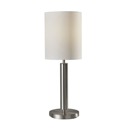 A simple, classic style with a bold presence, the Hollywood table lamp is the perfect choice for a modern bedroom or sophisticated living space.. The tall ivory silk shade complements a chunky brushed steel pole. Control the light with a convenient on/off touch sensor switch. Bulb is not included.Read More