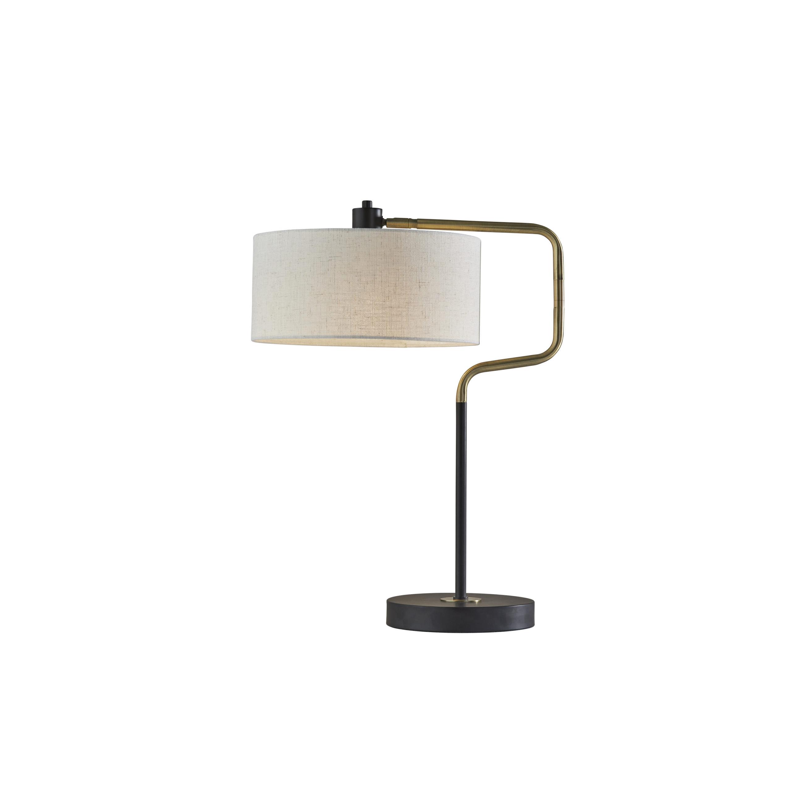 Clean lines and a modern, short drum shaped shade update the classic swing-arm style of the Jacob Table Lamp. A mix of black and brass metals add mid-century flare. The white fabric shade has soft flecks of natural colors, revealing a unique and beautiful texture when lit. Swing the arm to focus light where you desire. Bulb is not included.Read More
