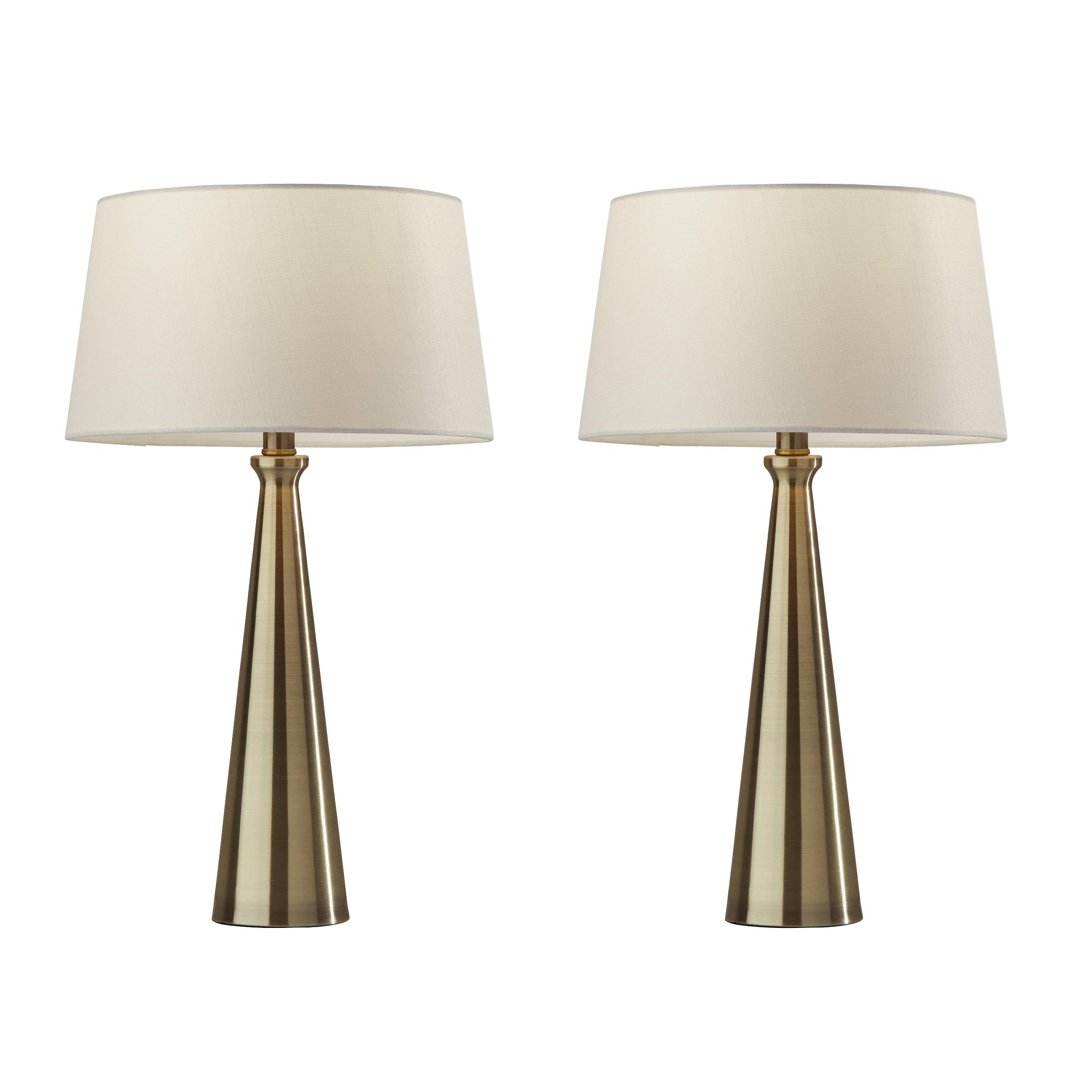 The perfect addition to your console table or for offering some warm, ambient lighting to your bedside tables, this pair of table lamps is a classy addition to any room in the home. A beautiful beige textured fabric shade sits atop an antique brass metal tapered base. A short modified drum shape of the shade comprises a more modern silhouette than most. Turn the lamps on and off with a convenient switch on the socket. All Adesso lighting product is either UL or ETL listed, meaning that it has been tested and approved to meet the government-regulated safety standards for the USA. Bulb is not included.Read More