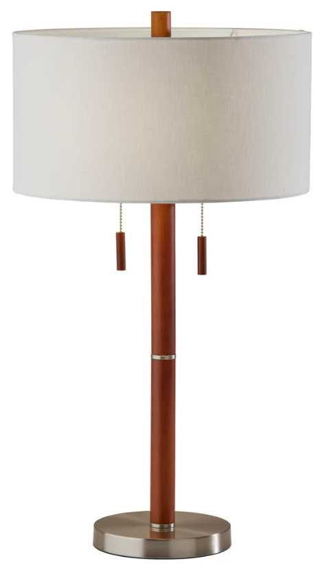 An essential addition to your home décor, this 28" tall table lamp’s body strikes a streamlined silhouette. It has a long walnut rubberwood stem featuring brushed steel metal accents and a sturdy round steel base.Read More