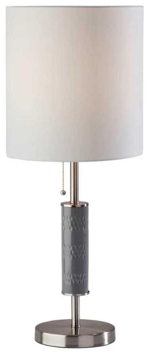 The 29" tall Vanessa table lamp brightens your space with a touch of contemporary styling. The lamp features a clean, round 7.25" diameter metal base with a brushed steel finish. A matching brushed steel stem with a cylindrical, diamond-patterned, grey ceramic accent piece brings a distinctive and eye-catching design.Read More