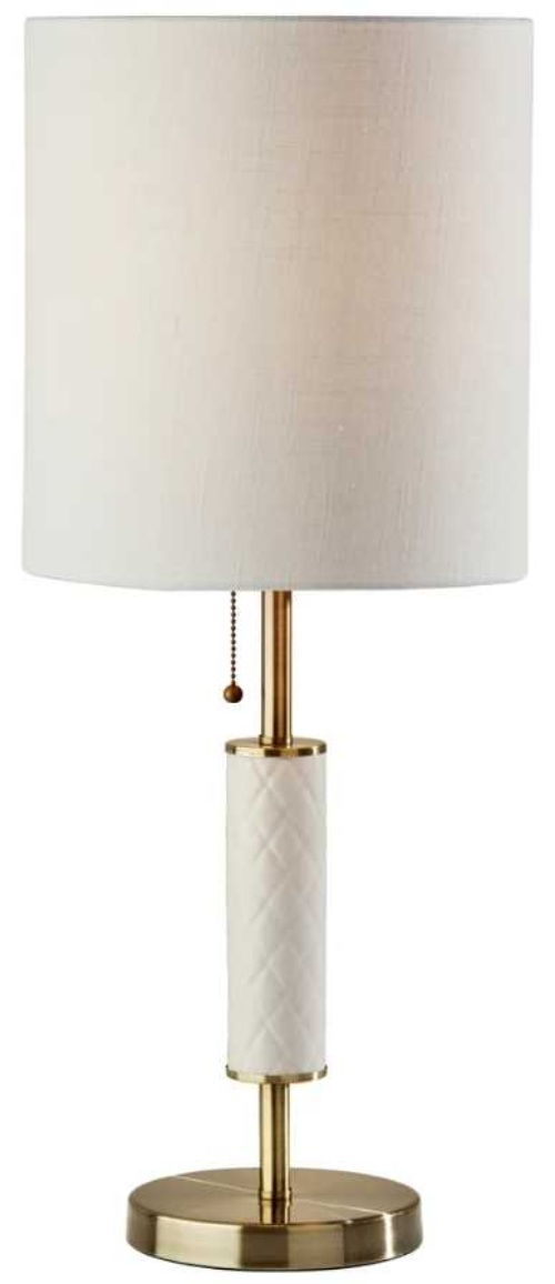 The 29" tall Vanessa table lamp brightens your space with a touch of contemporary styling. The lamp features a clean, round 7.25" diameter metal base with an antique brass finish. A matching antique brass stem with a cylindrical, diamond-patterned, cream ceramic accent piece brings a distinctive and eye-catching design.Read More