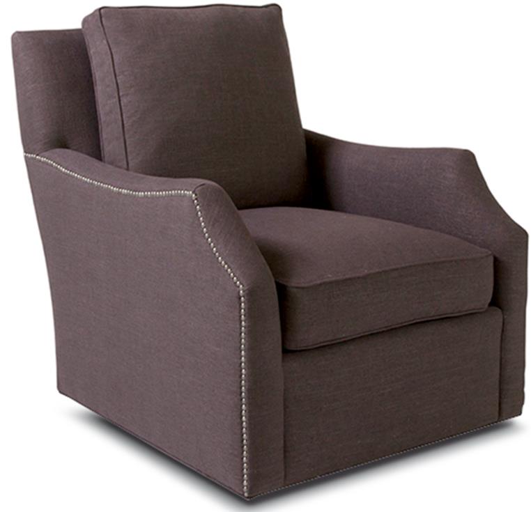 This design provides big comfort for small spaces! It features a thinly sculpted sloping arm, box border back and tall tapered leg, with hand-applied accent nail trim, giving it a sophisticated classic feel. It swivels 360 degrees and glides forward and backward for added versatility.Read More