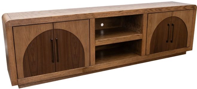 Bring home the Eclipse 92-inch TV stand console for sophisticated, reimagined vintage style. Beautifully crafted from oak solids and walnut veneers, this entertainment center rests atop a crisp plinth base and features striking two-tone finish inlay arch panels on the doors that mirror the curves of the top corners.Read More
