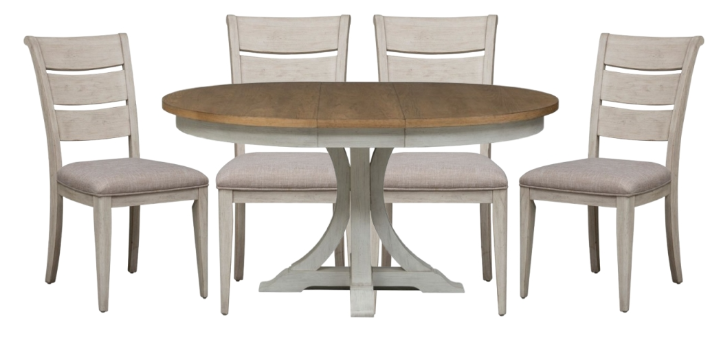 Wow family and friends with the Farmhouse Reimagined optional five-piece pedestal table set. Crafted of pine and poplar solids with hickory and pine veneers, this set features an antique white finish with heavy wire brush distressing and a chestnut top and consists of the pedestal table and four ladder back upholstered side chairs.Read More