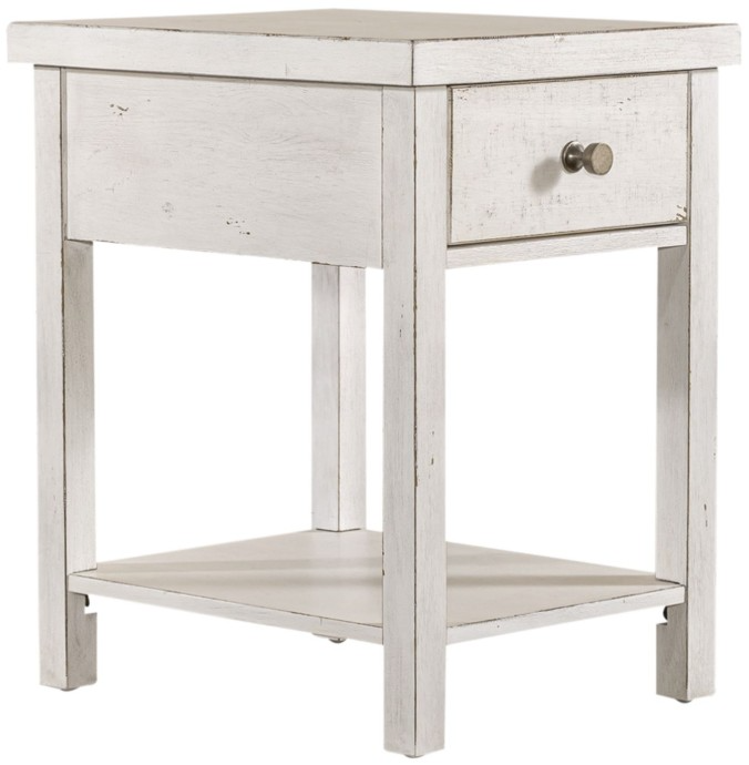 Enhance your space with the Modern Farmhouse drawer chair side table. Crafted of poplar solids with knotty white oak veneers, this piece features a flea market white finish with heavy distressing, a full extension drawer with a bottom shelf for additional storage, appealing washed brass knob hardware.Read More