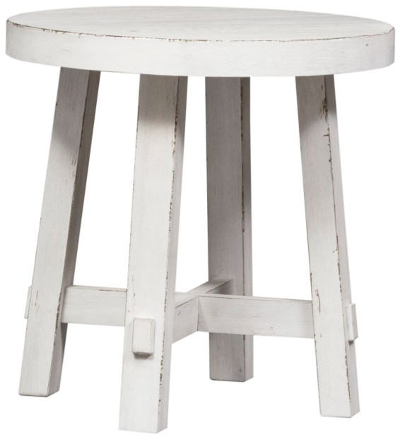 Enhance your space with the Modern Farmhouse splayed leg round end table. Crafted of poplar solids with knotty white oak veneers, this piece features a flea market white finish with heavy distressing, appealing high-low planked top, anchored by a splayed leg design.Read More