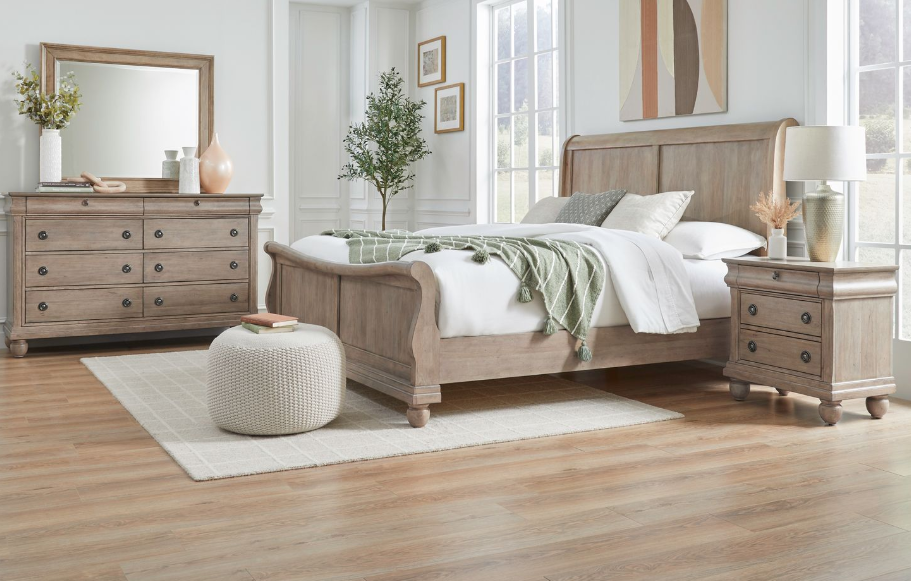 A luxurious four-piece bedroom ensemble including a california king sleigh bed, dresser with mirror, and nightstand. The warm Saddle Tan finish evokes a comforting, inviting atmosphere, exuding refined charm and relaxed elegance that transforms any master suite into a serene, welcoming retreat.Read More