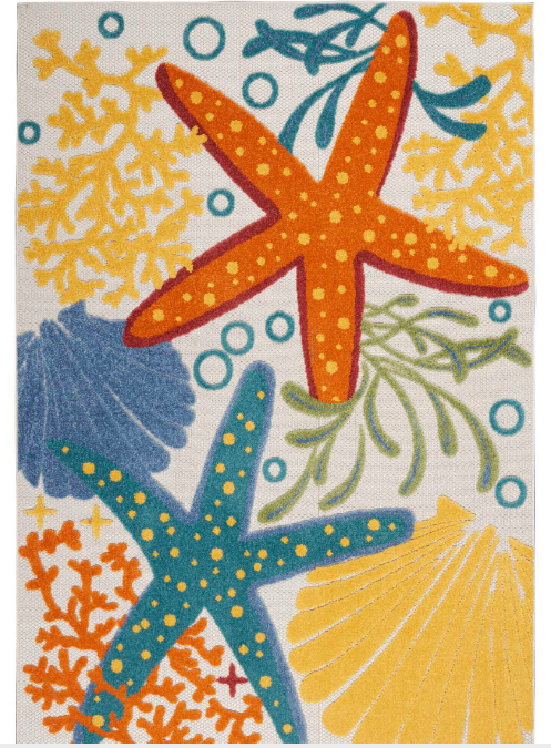 Roll out your own little slice of the beach life with this coastal indoor/outdoor area rug from the Aloha Collection. Breezy starfish, sea shells, and undersea bubbles woven in vibrant multicolor sets a foundation for festive days on your patio, deck, or anywhere inside your home. Expertly machine made.Read More