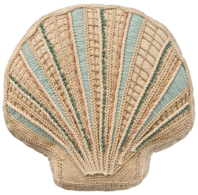 Bring the essence of the sea indoors with this seashell-shaped decorative pillow. The fully embellished front cover features a variety of textures including jute netting, stitched threads, and braids arranged in the style of a clamshell. Cover made from 100% cotton.Read More