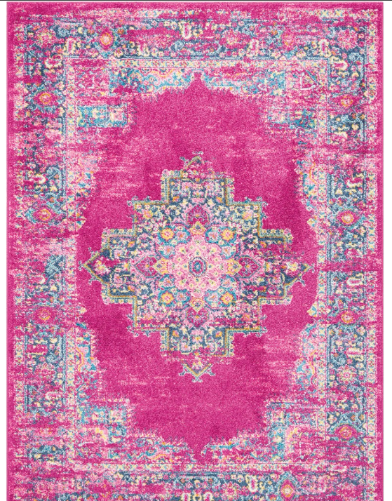 This beautifully distressed Persian medallion rug merges traditional bordered rug style with a contemporary vibrance. The pink-on-pink design is adorned with traditional Persian designs in blue, orange, and green, creating a bold statement piece that will stand out in any space. The distressed effect creates a vintage vibe.Read More
