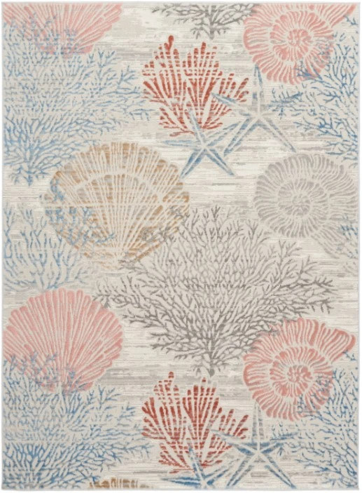 Transform your space into an oceanside getaway with this Seaside rug. Featuring coral and seashell motifs in pink, blue, tan, and gray on a soft gray ground, this coastal rug is machine made with a super-soft, polypropylene-polyester blend in a high-low pile for added textural interest.Read More