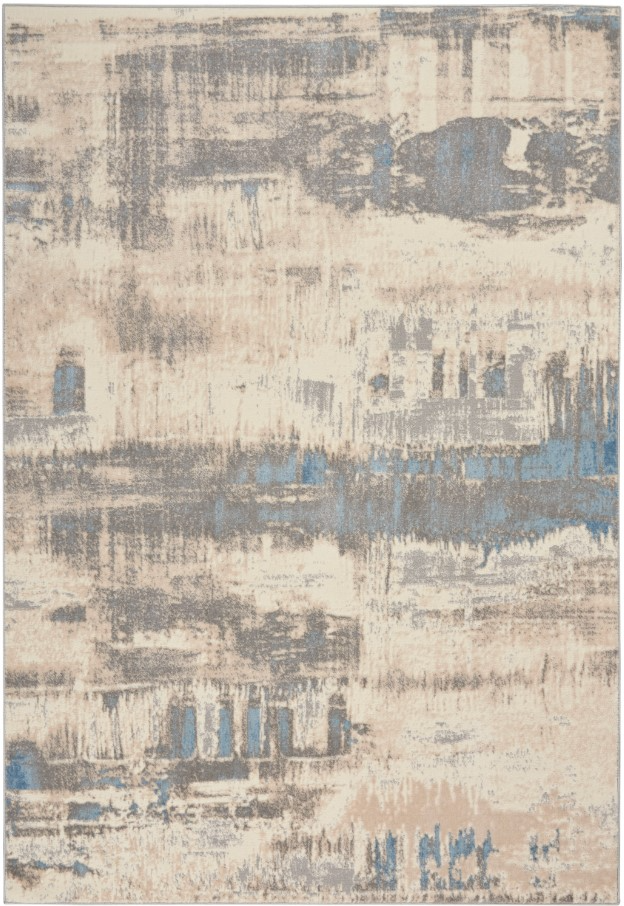 Distressed abstract pattern in grey, blue, cream, and ivory adds a subtle wash of color to modern and contemporary décor