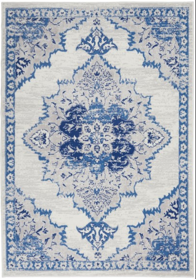Neutral ivory and blue palette with abrash finish adds a vintage, timeworn effect to bohemian and farmhouse styles of décor