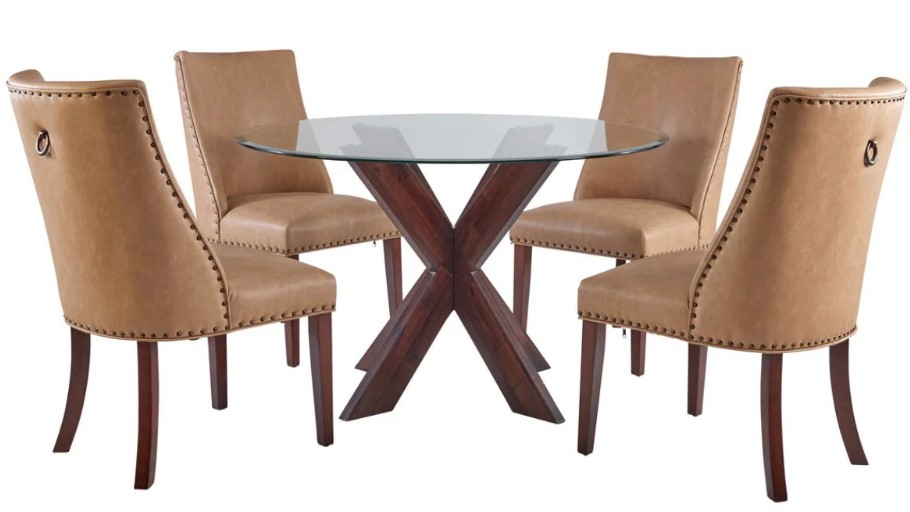 Invite new energy and excitement into your dining space with this contemporary 5 piece set. The table features a round beveled glass top placed over an industrial crisscross base made of solid acacia wood.Read More