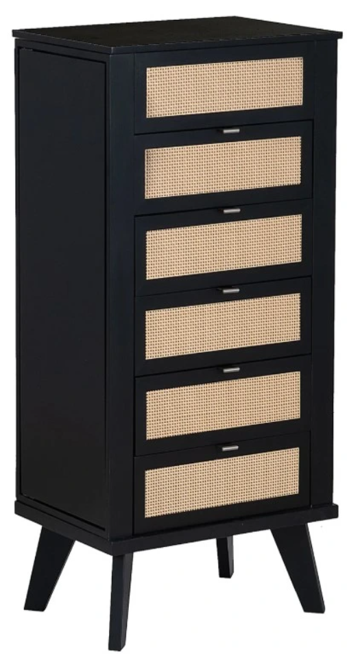 Meet the jewelry armoire that balances timeless style with everyday function. Available in sleek black or warm natural finishes, each piece is crafted from durable MDF and Baichun wood and accented with a charming cane inlay for a modern yet organic touch.Read More