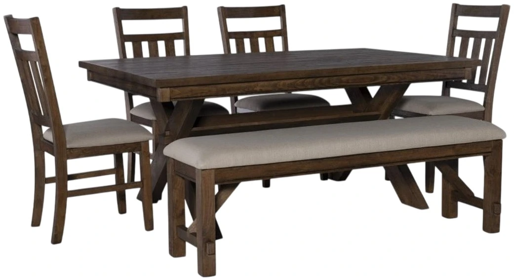 Includes table, bench, and four dining chairs