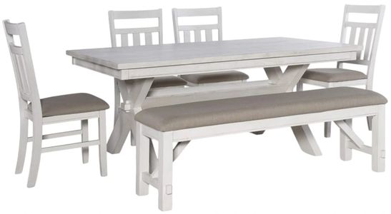With an effortless blend of style and support, this handsome, wooden, six-piece dining set includes a plank-style table with a bold, X-shaped base, plus four dining chairs and one bench.Read More