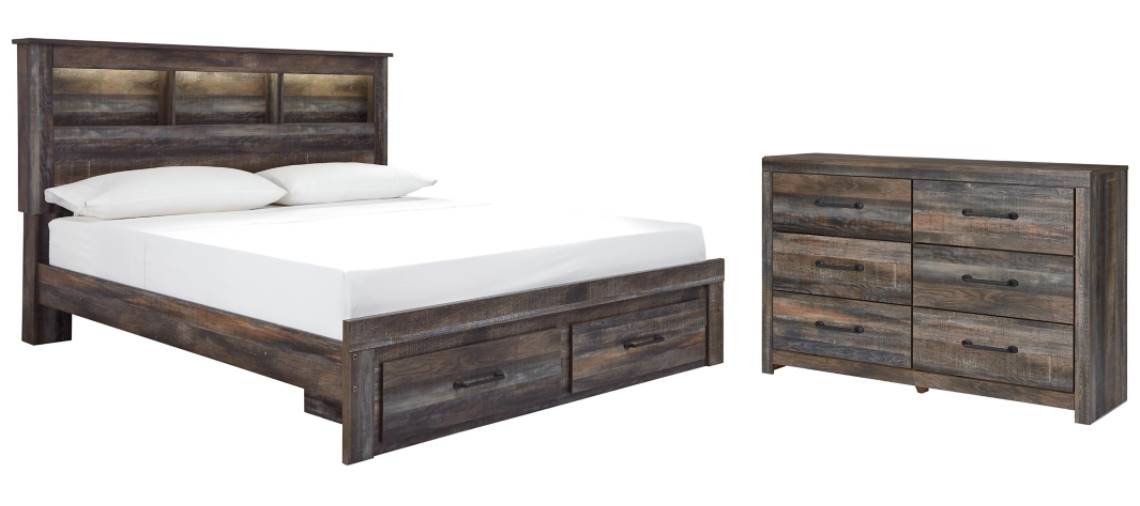 Includes bed (bookcase headboard, 1-drawer storage footboard and rails) and 6-drawer dresser