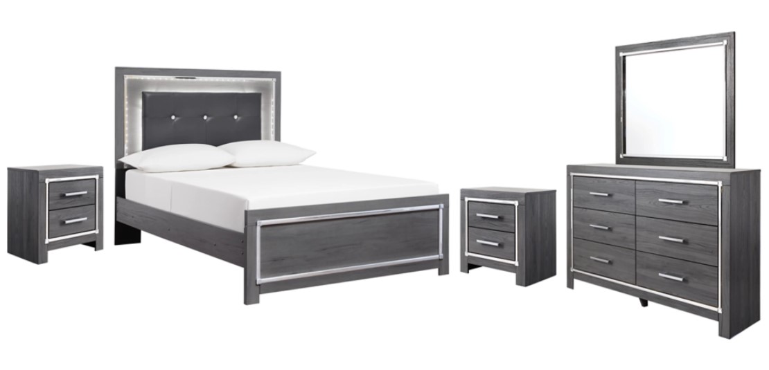 Includes bed (with headboard, storage footboard and rails), dresser, mirror, and two nightstands
