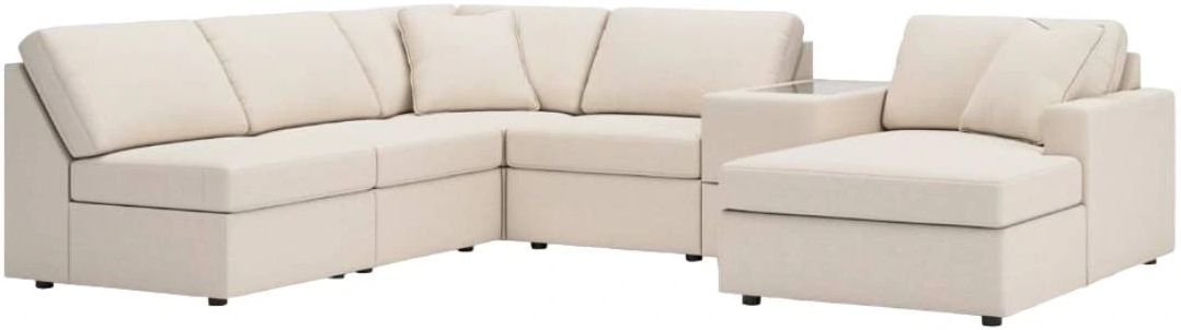Includes 6 Modular Pieces: Right-arm facing corner chaise, 3 armless chairs, console with storage and wedge