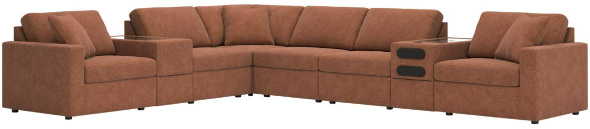 Includes 8 Modular Pieces: Left-arm facing corner chair, audio console with storage, console with storage, wedge, 3 armless chairs and right-arm facing corner chair