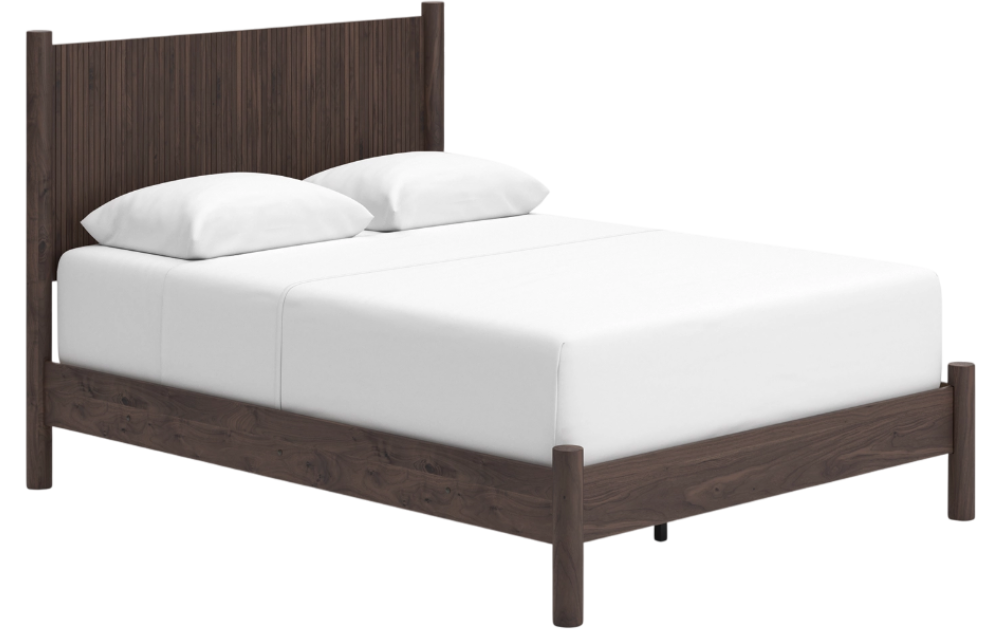 Crafted with both form and function in mind, this queen panel bed brings a dash of retro-cool character to your modern boho aesthetic. Its reeded headboard adds an on-trend touch to the classic silhouette. Warmly welcoming with a rich brown finish, the bed pairs well with muted hues.Read More