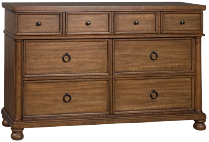 This artfully crafted dresser combines classic elements with a clean modern approach. Its rich medium brown wood tone exudes a comfy, timeless appeal that's sure to carry you away to a dreamy time and place. Simple round metal knobs and ring pulls on the dresser's spacious drawers make just the right statement.Read More