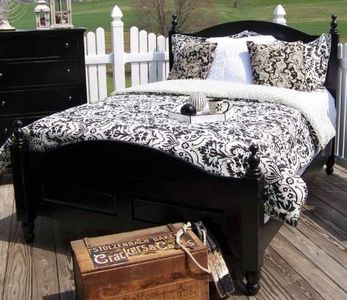 The versatile Wrightsville Sleigh Collection based on a West Indies design has a casual cottage feel when paired with our antique white rub through, or a modern country feel when used in oak with our sunset finish, as pictured.