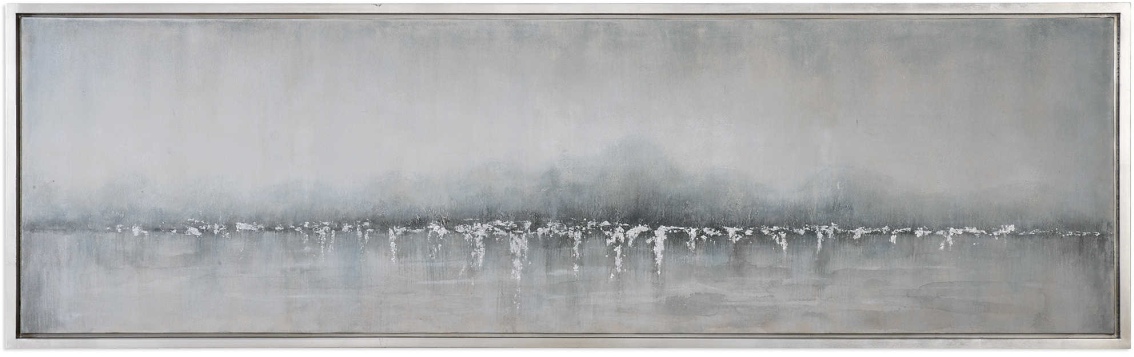 Hand Painted On Canvas, This Abstract Artwork Transcends Multiple Design Styles. A Versatile Color Palette Of Light Gray, Cream, And Icy Blue Is Complimented By Silver Leaf Accents. The Canvas Is Stretched And Applied To Wooden Stretchers Before Being Encased By A Silver Leaf Gallery Frame.Read More
