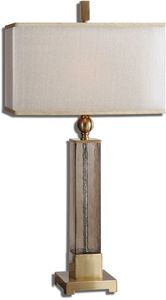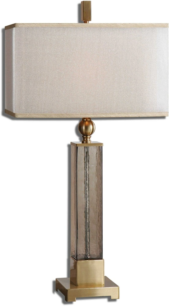 The Caecilia table lamp textured light amber glass accented with brushed brass plated details. The double rectangle hardback shades are a golden champagne inner shade with a warm champagne, silken sheer outer shade.Read More
