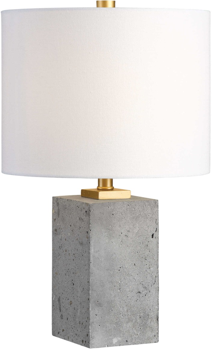 Thick block of porous, lightly stained concrete, accented with brushed gold painted details. The round hardback drum shade is a white linen fabric.Read More