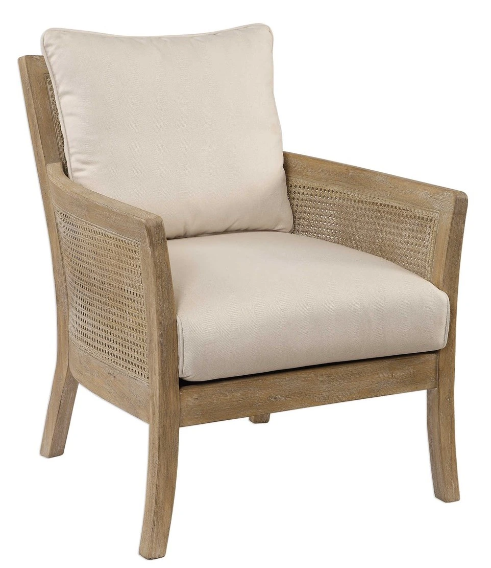 High supportive back and curvy flair arms make a grand style statement in a lightly glazed and bleached sandstone exposed hardwood finish with cane sides, tailored in a durable yet lush off-white fabric with added performance treatment to resist soiling and stains.Read More