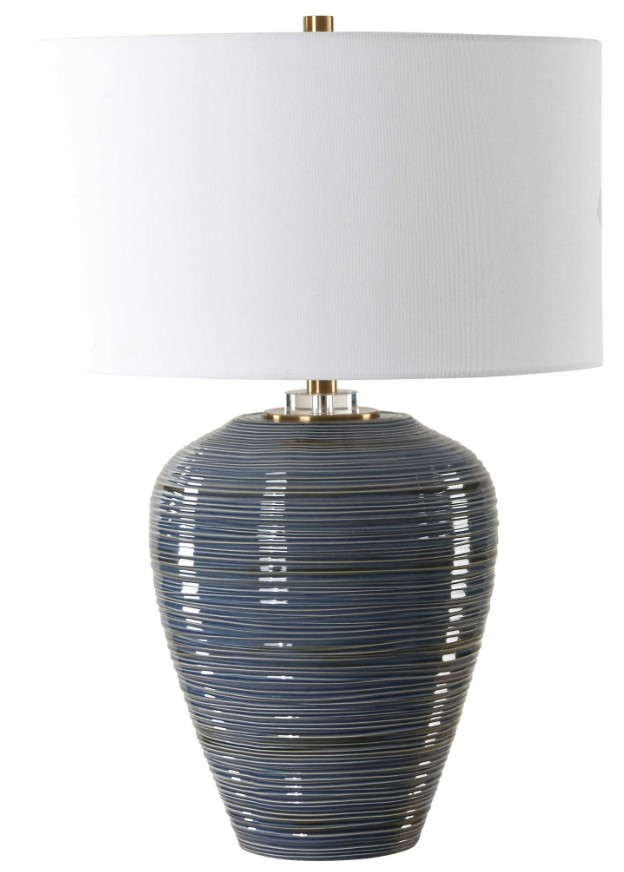 Illuminate your space with this stunning table lamp, featuring an organically ribbed texture and glossy blue glaze with darker blue details, complemented by plated brass accents. Enhance any decor with its timeless elegance and warm ambiance. The round hardback drum shade in crisp white linen completes the look.Read More
