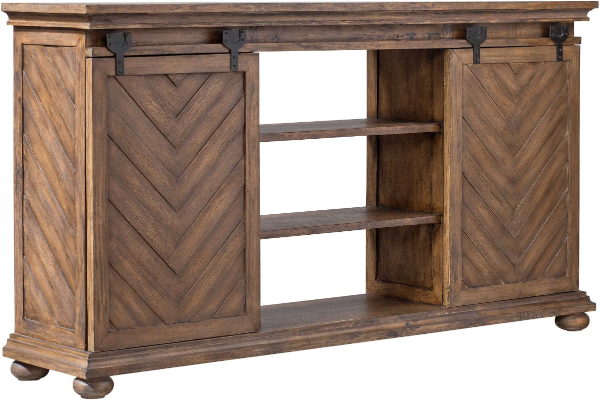 A craftsman built media piece finished in antique honey over mango veneer, featuring chevron patterned sliding doors with carved molding details and a classic bun foot. Aged black iron sliding hardware allows for concealing or revealing multiple storage options.Read More
