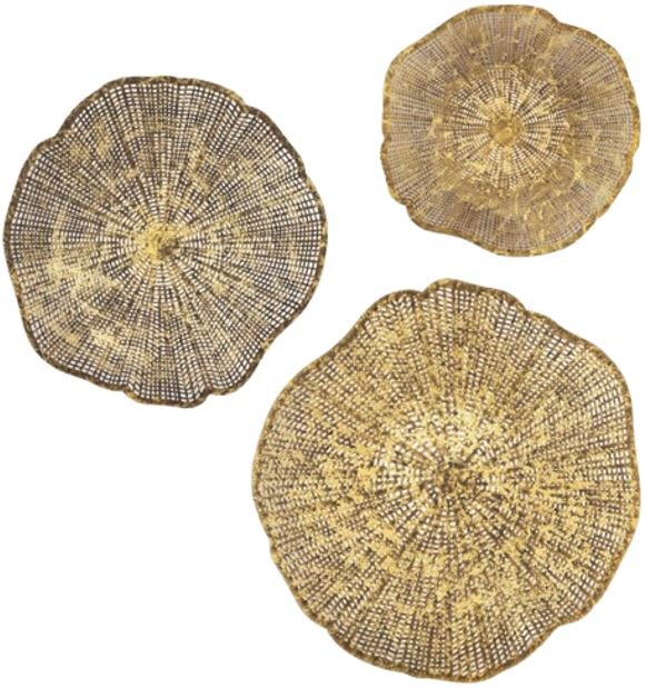 Radiant flowers of laser cut metal are finished in gold with natural distressing to create depth and richness to any space. Use multiple for a more dramatic display, hanging from any direction.Read More