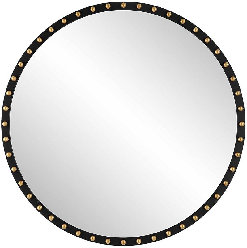 This oversized round mirror is made from solid Beech wood finished in a matte black, adorned with lightly distressed gold leaf wood ball details. Transform your home into a sanctuary of style with this exquisite mirror that transcends trends and stands as a testament to your impeccable taste.Read More