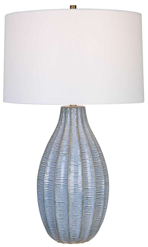 Inspired by old-world pottery, this ceramic table lamp features scalloped channels with an organic striped texture, finished in a light cornflower blue glaze with aged distressing. Steel hardware is finished in plated antique brushed brass. The slightly tapered hardback shade is covered in a white linen fabric.Read More